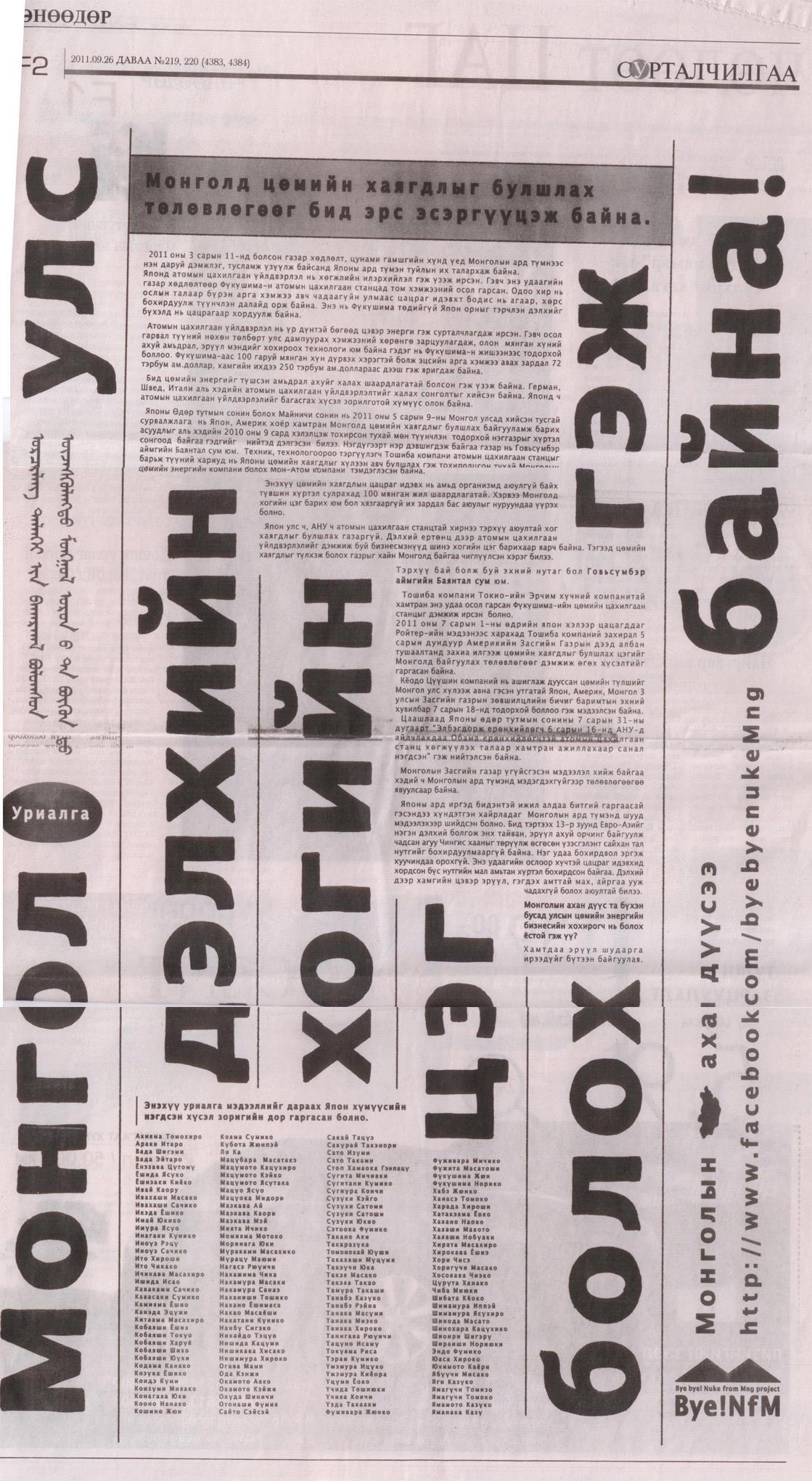Япончуудын эсэргүүцэл Монгол сонинд нийтлэгдэв